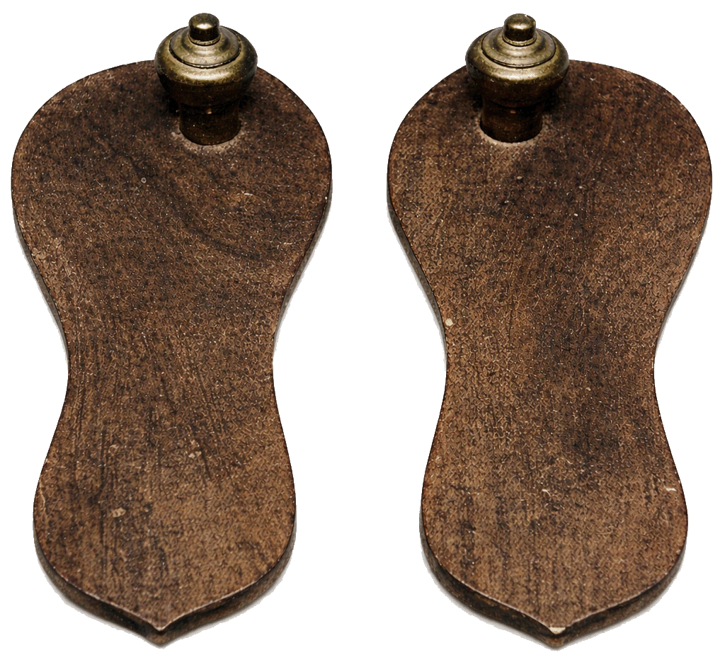 (two wooden pieces, with bells and small circular plates, with brass grips